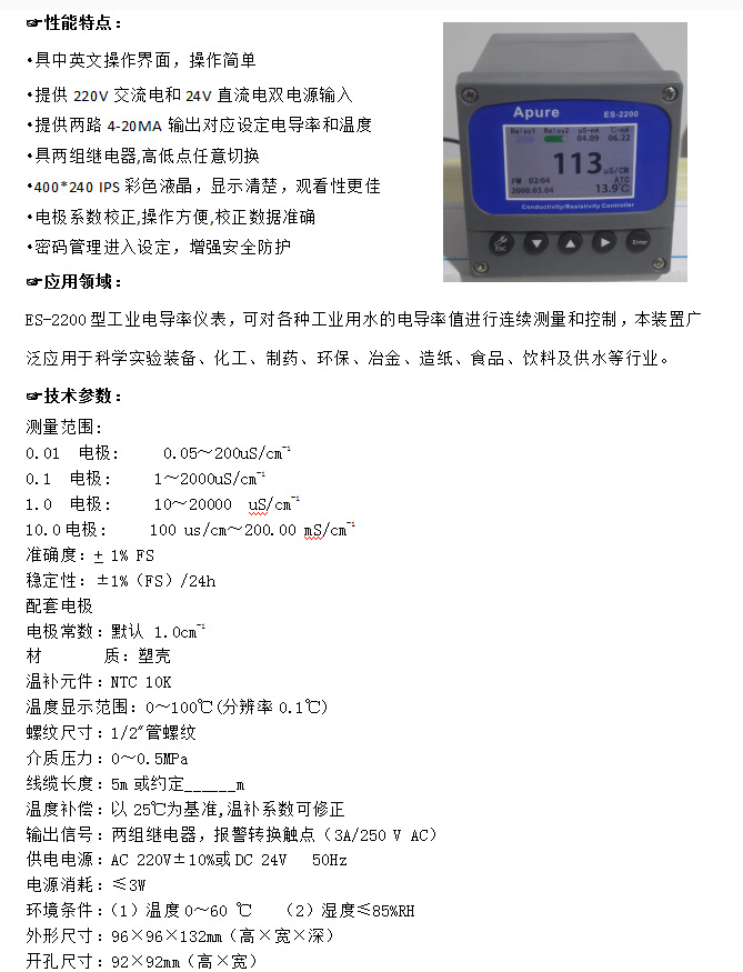 型號:愛普爾Apure工業在線電導率/電阻率儀ES-2200