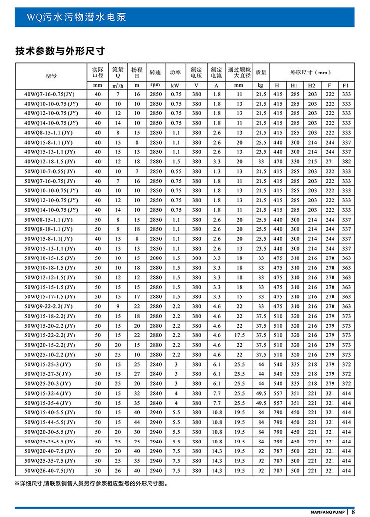 產品說明:南方WQ污水污物潛水電泵由電機與泵兩部分組成,兩者通過油室及機械密封組件隔開,分固定式自動耦合安裝和移動安裝。