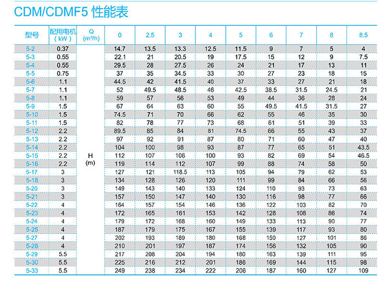 型號 | 揚程 | 功率 | 級數 | 電機功率 | 重量 |