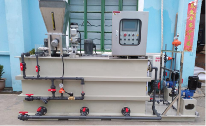 溶液箱的有效容積為500~5000L,它分成三個小室為配藥室、熟化室和儲液室,三個小室內設有特制的攪拌機進行溶解攪拌,個室為預制部分,后兩段進一步進行攪拌,使藥劑與水充分混勻,制成均一濃度的溶液供使用。各室之間有溢流口進行連通,室滿后,流入第二室,依此類推,最后進入儲藥室內,儲藥室內有高中低三個點液位傳感器,高液位為緊急停干粉投料器并停止進水,中液位為啟動干粉投料器與并進水,至低液位時,停計量泵。其中最高位與最低位時,在顯示屏上都會顯示液位狀態,提醒操作人員是否供水故障(水壓不足、中間管道被堵、電磁閥漏水)或計量泵未工作。
