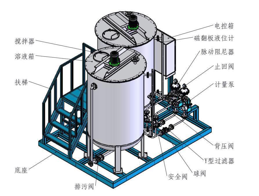 本裝置由二個計量箱、三臺計量泵、三套交流變頻式自動加藥控制系統、連接管路、閥門、底座等組成見圖2