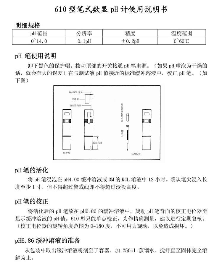 使用簡易,口袋型pH測試筆,無周遭溫度應用功能。具單點校正功能,使用電源為1.5 V電池四顆。