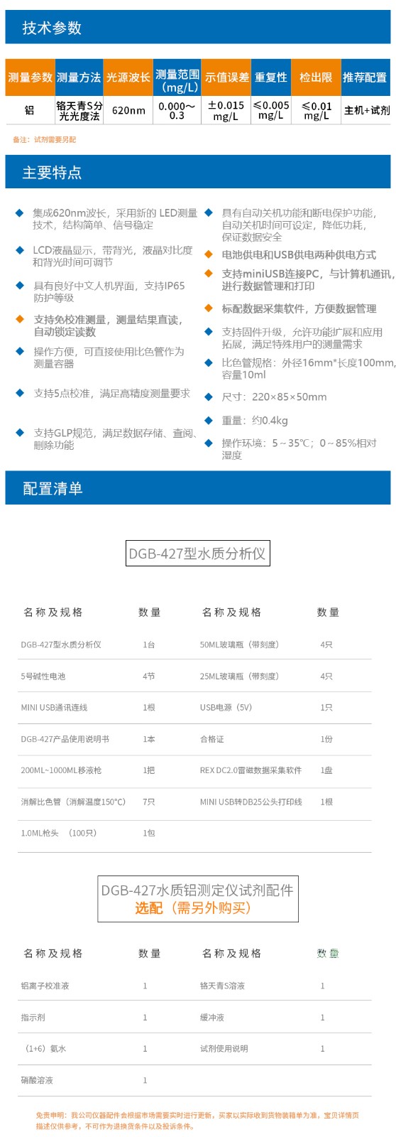 上海雷磁DGB-427便攜式水質測定儀免校準測量水質分析儀 鋁測試儀