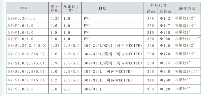 材質有304、316、內襯式及PVC等,我公司備有以下型號的產品,可供客戶選擇,若有特殊需求,可單獨訂購。膜片式脈沖阻尼器高使用壓力為:PVC材質的為1.0MPa,金屬材質的為2.5MPa,禁止超壓使用,以免殼體破裂發生危險。使用溫度不高于75℃。使用溫度不低于5℃,建議使用溫度10~45℃。
