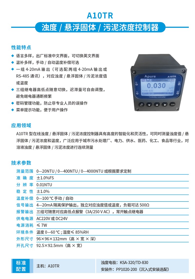 Apure工業濁度儀A10/A20TR盤裝在線濁度計懸浮固體污泥濃度 控制器