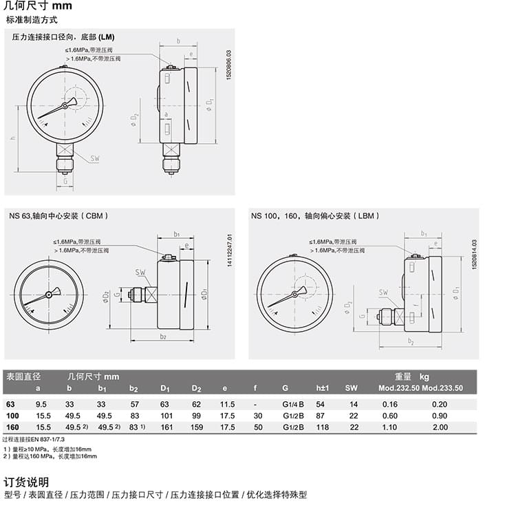 2. 膜片壓力表,化學工業型,表頭不充液/充液,高過壓保護壓力表,針對UHP應用:422.12 432.50 432.56 423.36 423.25