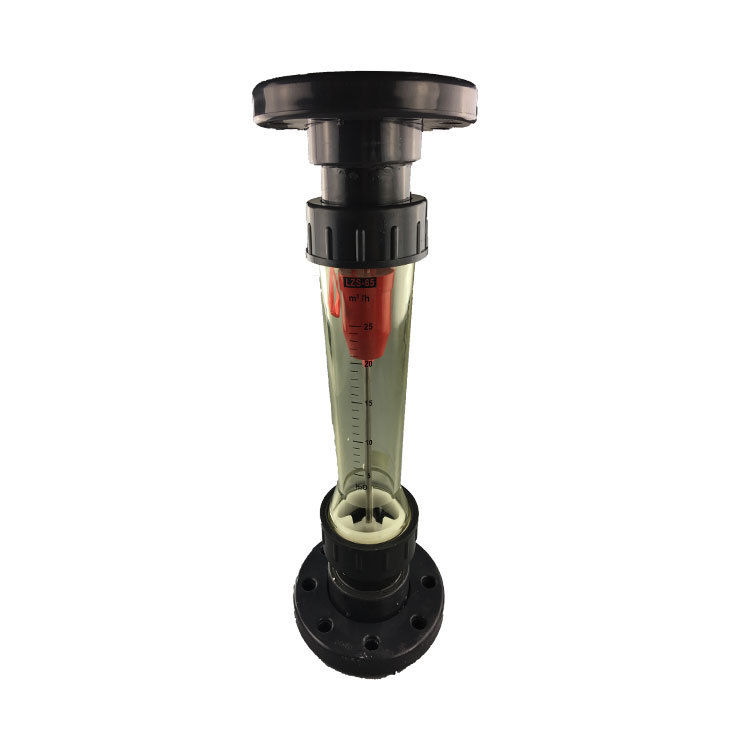 塑料流量計結構如圖:主要由小端向下,大端向上垂直安裝的透明塑料錐管和在錐管內可上下移動的浮子作為測量元件,與螺母、接管、止檔及“O”型圈等構成。當流體在錐管內自下而動時,在浮子上下產生壓差,使浮子上升,當此壓差與浮子重力、浮力及粘性力處于力平衡時,浮子處于靜止位置,當流量變化時,流經錐管與浮子間環隙處流體的流速變化,浮子上下的壓差相應變化,浮子作上下移動,因此浮子靜止位置的高度可作為流量的量度。