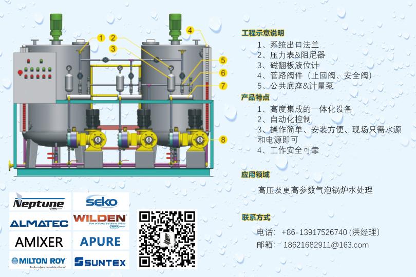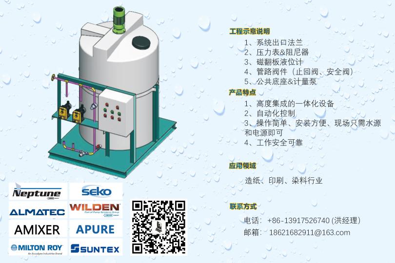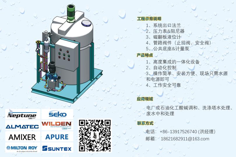 循環水加藥裝置,示蹤劑加藥裝置,遠程控制DCS加藥裝置,PAC加藥裝置,PAM加藥裝置,酸堿中和加藥裝置,冷卻塔加藥裝置,干粉投加裝置,高分子自動泡藥機,PAM自動制備系統,絮凝劑制備系統,PAC自動溶解混合配制裝置,純水反滲透裝置,軟化水系統,過濾系統,遠程控制系統,安全閥,背壓閥,流量校正柱,管道式流量計等。