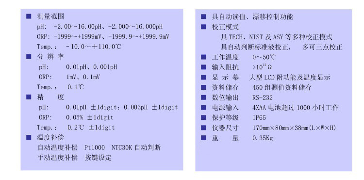防水、外觀輕巧、攜帶方便,具自動溫度補償功能;大型LCD屏幕,方便讀取測值。具備多種自動校正功能與低耗電特性,適合野外量測或現場制程及廢水處理等量測。