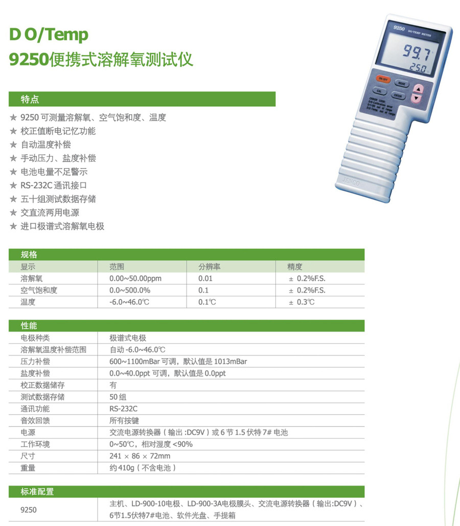 參數(shù):0~50ppm,0~500%,-6~46.0℃,鹽度補償范圍0~40.0ppt,壓力補償范圍600~1100mBar,50組數(shù)據(jù)存儲,RS-232C(極譜式)