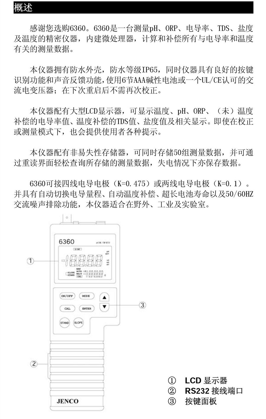 6360為手提式pH/CON/SAL/mV/TEMP.檢測儀,具防水外殼、RS-232C界面,供儀器與各個IBM兼容PC連結。本儀器pH分辨率與mV范圍為0.1,鹽度范圍為0.0至80.0ppt(分辨率0.0ppt)??蛇x擇性導電電池(K=1.0 or K=5.0)與其范圍為(uS或mS.)。