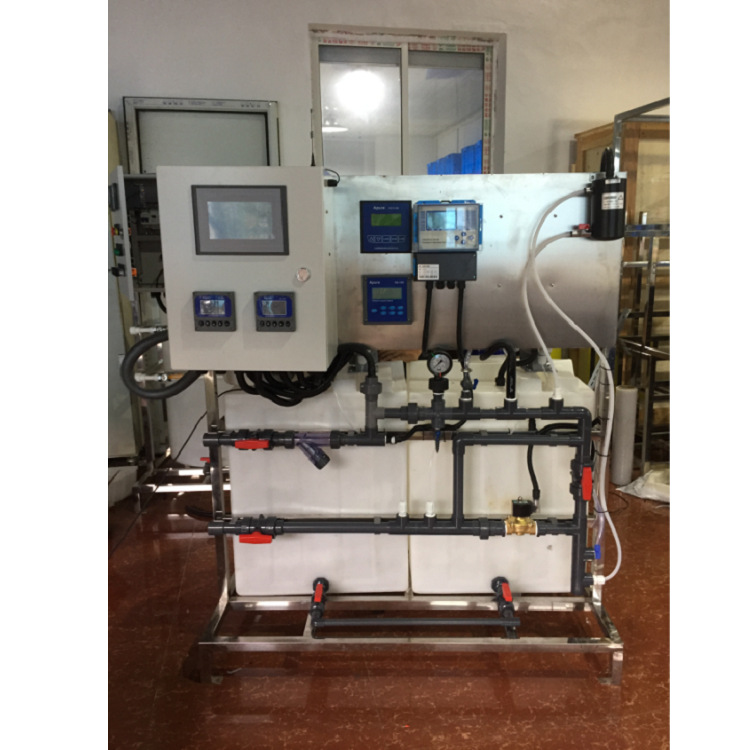 示蹤劑加藥裝置由示蹤劑儀表、PH儀表、0RP儀表、電導率儀表、控制系統、無線遠傳系統等部分組成。其工作原理是由示蹤劑儀表檢測循環水系統中藥劑的濃度,進行PID運算,然后自控制系統啟動或關閉加藥泵往循環水系統添加藥劑。其功能是使藥劑穩定在一定的濃度范圍,達到保護管道不會結垢或腐蝕的趨勢。循環水系統進行排污或補水時,只要藥劑濃度滿足設定值,加藥泵依然不向系統中投加藥劑。從而節約客戶使用藥劑的成本。
