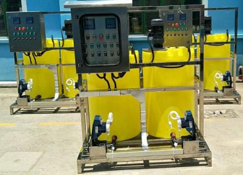 3、關閉排污閥、管道閥、自動或手動加注藥液,按通電源、電控柜、電源指示燈亮則表示電源接通。按下攪拌罐體按鈕,攪拌機開始工作3—5分鐘后,打開管道閥門、打開流量控制閥,按下計量泵啟動按鈕,計量泵開始工作。